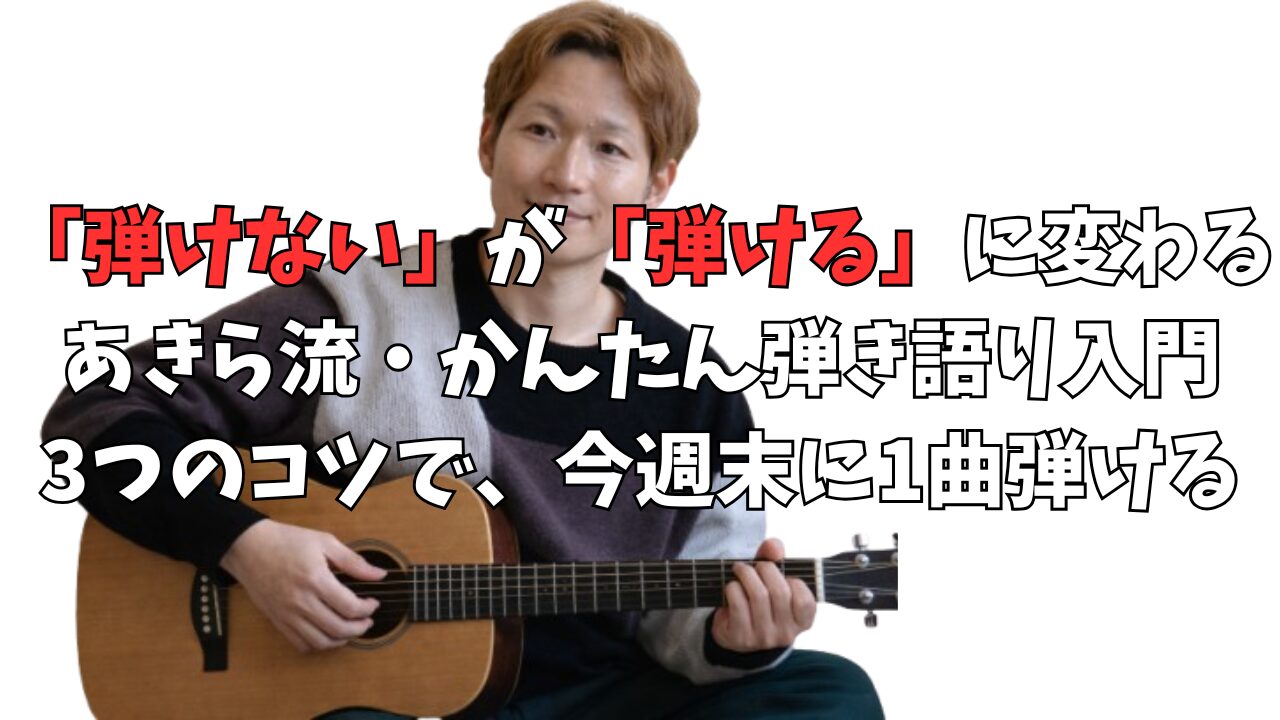 現在、有料講座『あきら流!ギター弾き語りのためのアレンジ・ラボ』で提供している**【Lv.1:ギターの基礎コース】を丸ごと無料でプレゼント中! 無料とは言え、実際販売しているもので今すぐ使える知識を詰め込みましたので、人に寄ったらこれだけでギターが弾けるようになる、弾き語りができるようになると思ってます。